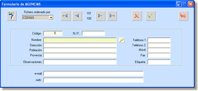 El formulario de agencias, al igual que otros formularios maestros, se compone básicamente de dos partes: