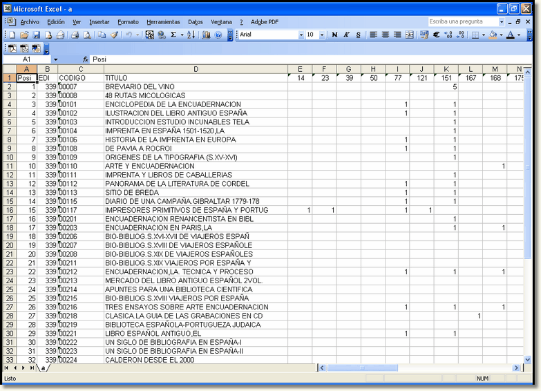 Esta tabla es la principal del programa. En ella podemos ver a la izquierda, en vertical, todos los libros a reclamar. Si se puso una editorial, aparecerán todos los libros que haya en depósito de esa editorial. En la parte superior, en horizontal, vemos los códigos de los clientes. Si el código es superior a 999, aparecerá el código partido en dos líneas. Arriba los miles y abajo las tres últimas cifras.